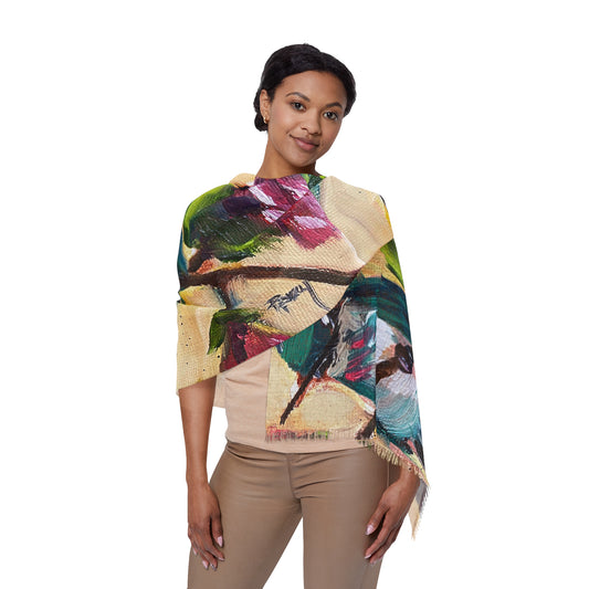 Colorful Scarf — Artistic Lightweight Neck Wrap- Hummingbird on a Rose Bush