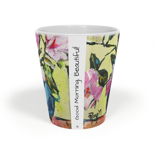 Pink Gardenias in a Blue Vase "Good Morning, Beautiful!" Latte Mug, 12oz