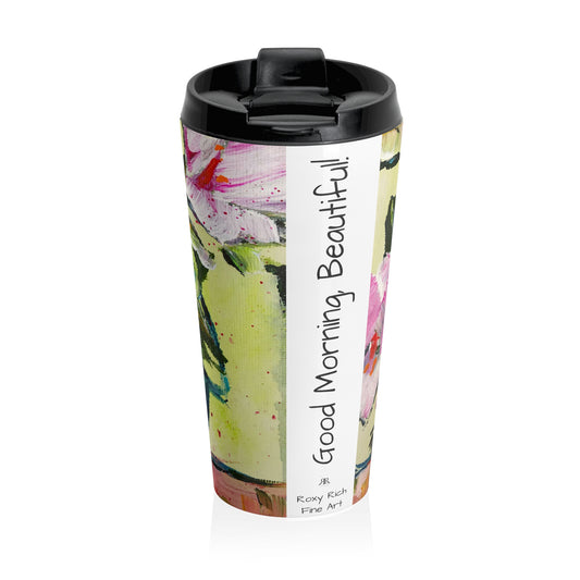 Pink Gardenias in a Blue Vase "Good Morning, Beautiful!" Stainless Steel Travel Mug