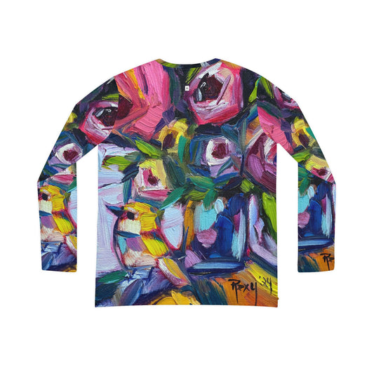 Long Sleeve Shirt-Abstract Roses with Tit Bird- V-neck Women's