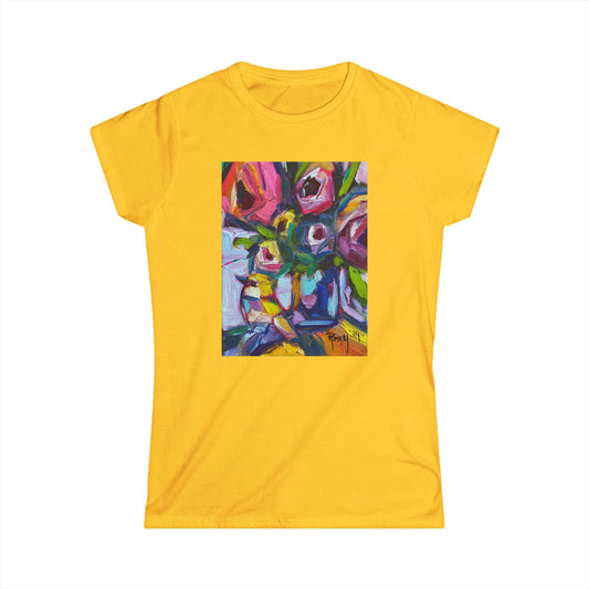 Abstract Roses and Yellow Bird Women's Softstyle Semi-Fitted Tee