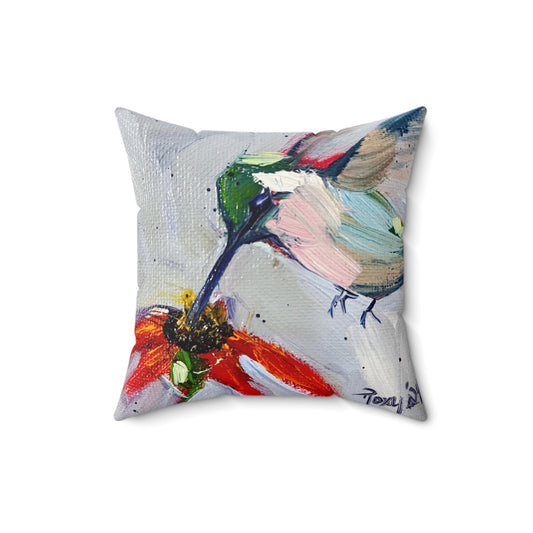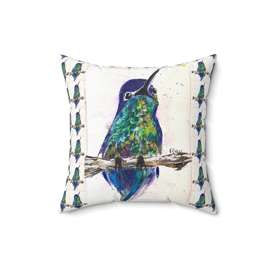 Adorable almohada cuadrada de poliéster hilado para interiores con colibrí de vientre pulido