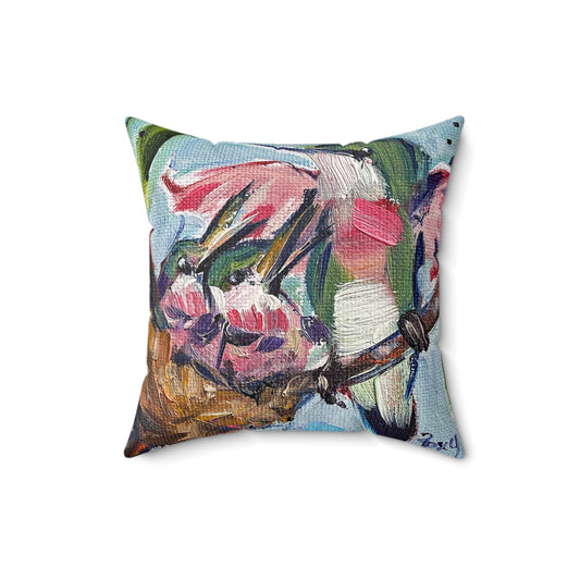 Hungry Hummers (colibrí en el nido con bebés) Almohada cuadrada de poliéster hilado para interiores