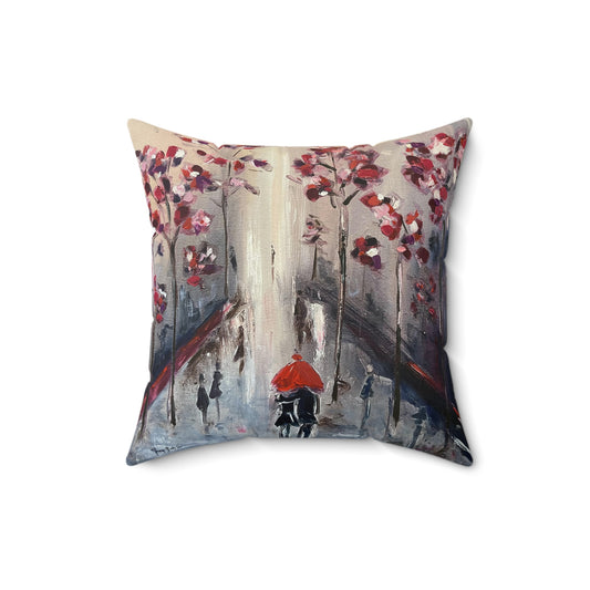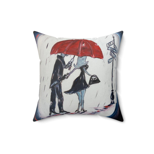 Caminando bajo la lluvia (pareja romántica) Almohada cuadrada de poliéster hilado para interiores