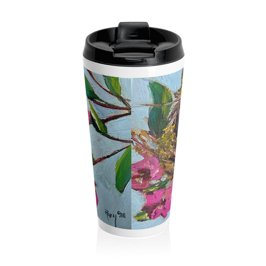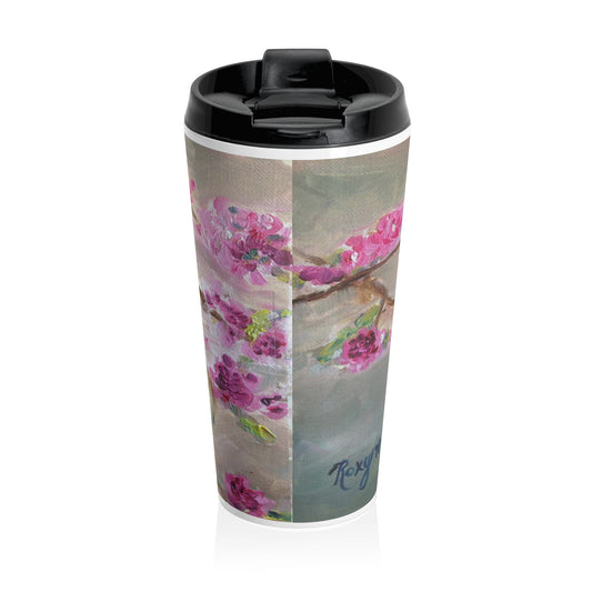 Taza de viaje de acero inoxidable con pájaro azul posado en una rama de flores de cerezo