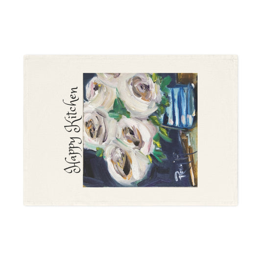 Paño de cocina de algodón orgánico vegano con Happy Kitchen y cuadro original al óleo de rosas blancas impreso en él.