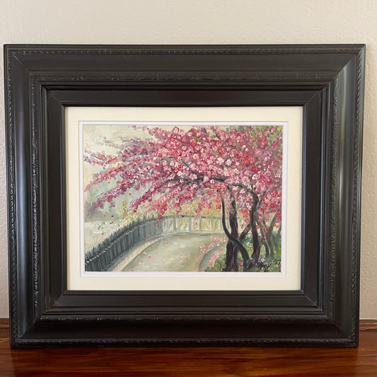 Abril en París Pintura de paisaje al óleo con flores de cerezo enmarcada