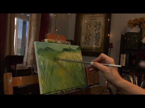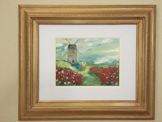 Molino de viento en un campo de amapolas Pintura original de paisaje al óleo enmarcada