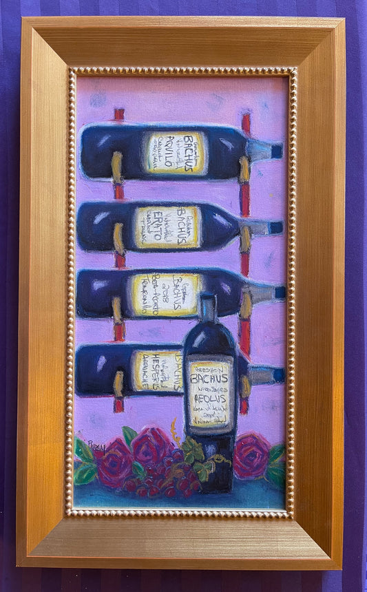 Gershon Bachus Vino y Rosas-Original Pintura Pastel al Óleo 10 x 20 Enmarcada