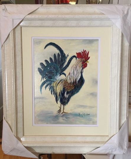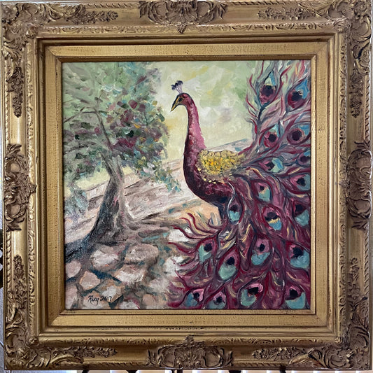 Pavo real púrpura -Pintura al óleo original de Cotswold enmarcada