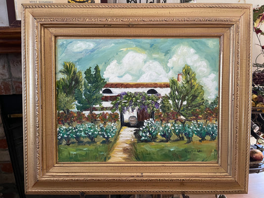 Viñedo y bodega Somerset- Pintura al óleo original enmarcada 14 x 18