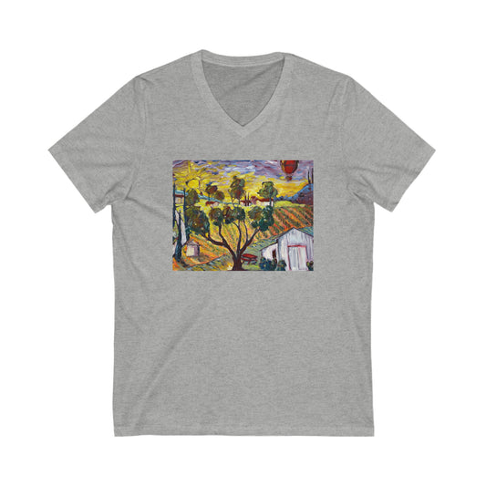 Hill to the Barrel Room en Gershon Bachus Vintners-Unisex Jersey camiseta de manga corta con cuello en V