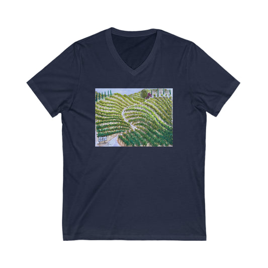 Hill to the Barrel Room en Gershon Bachus Vintners-Unisex Jersey camiseta de manga corta con cuello en V