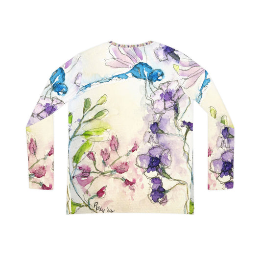 Long Sleeve Shirt- Blue Dragonfly with Purple Tube Flowers- V-neck Women's