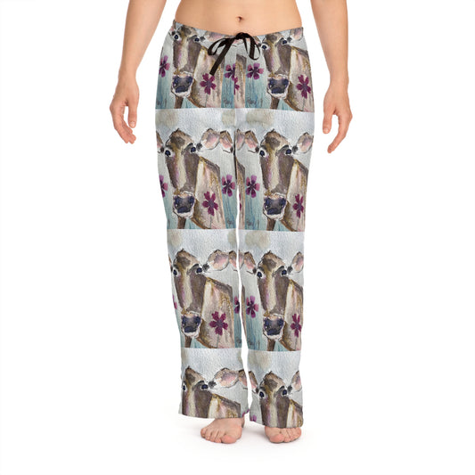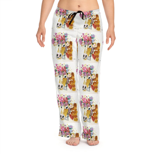 Pajama Pants - Adorable Cow with Flowers on its Head- Women's Pajama Pants