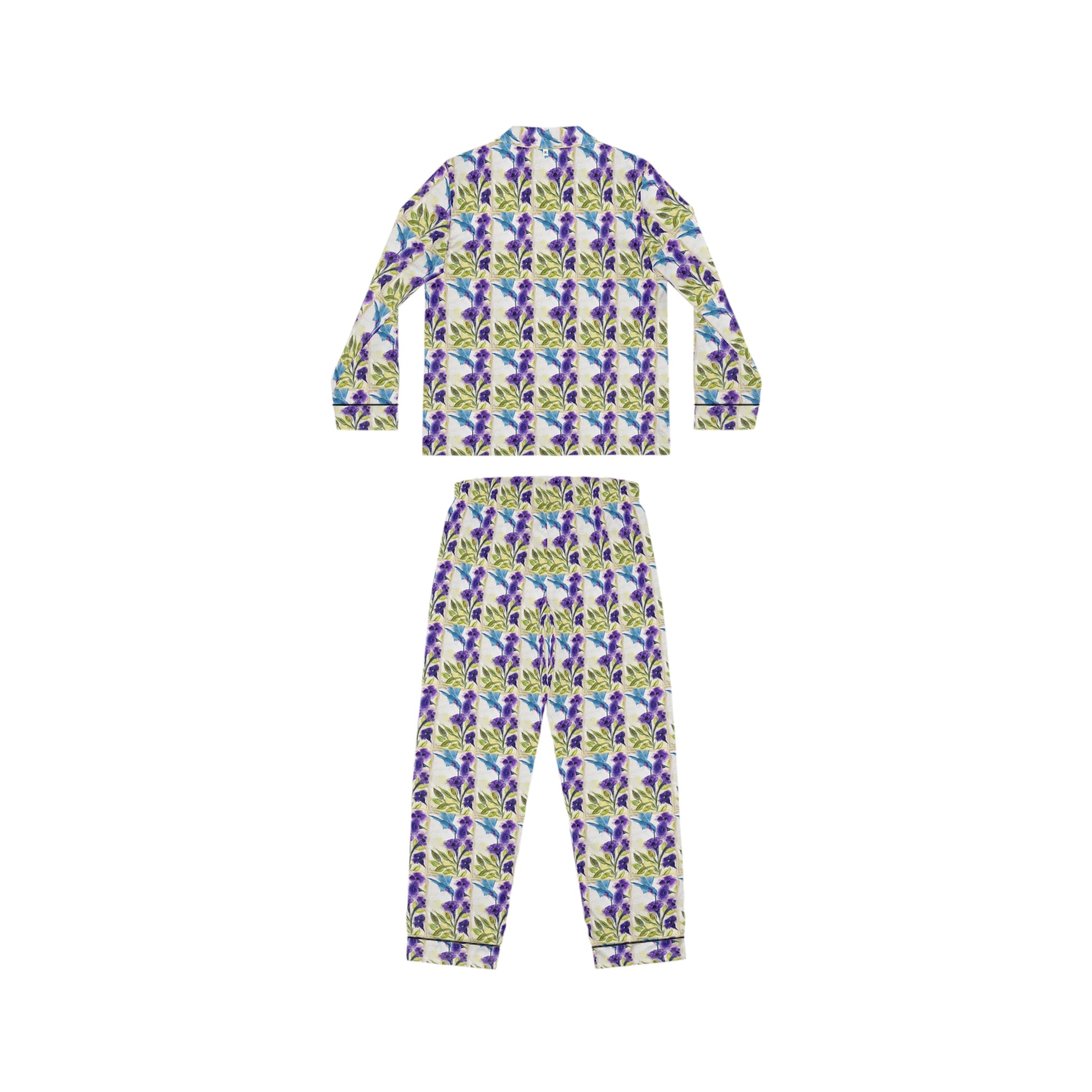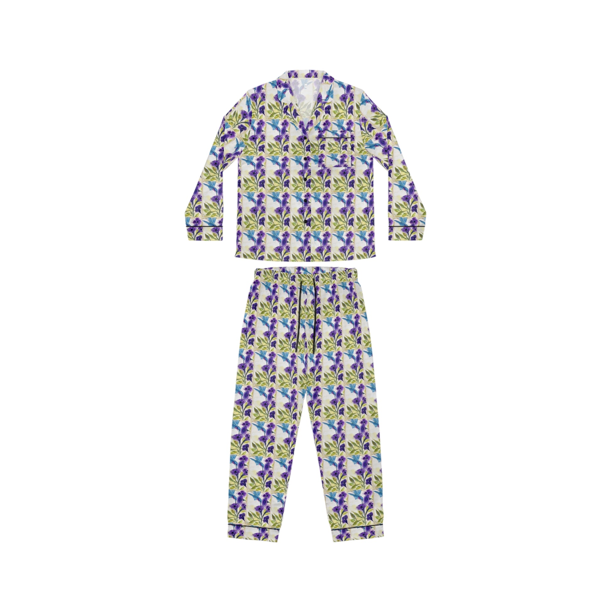 Satin Pajamas — Luxurious Silky Sleepwear Set- Hummingbird with Purple Flowers