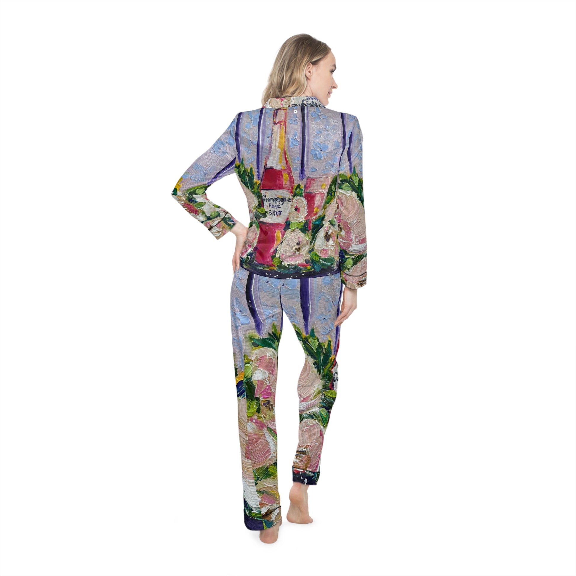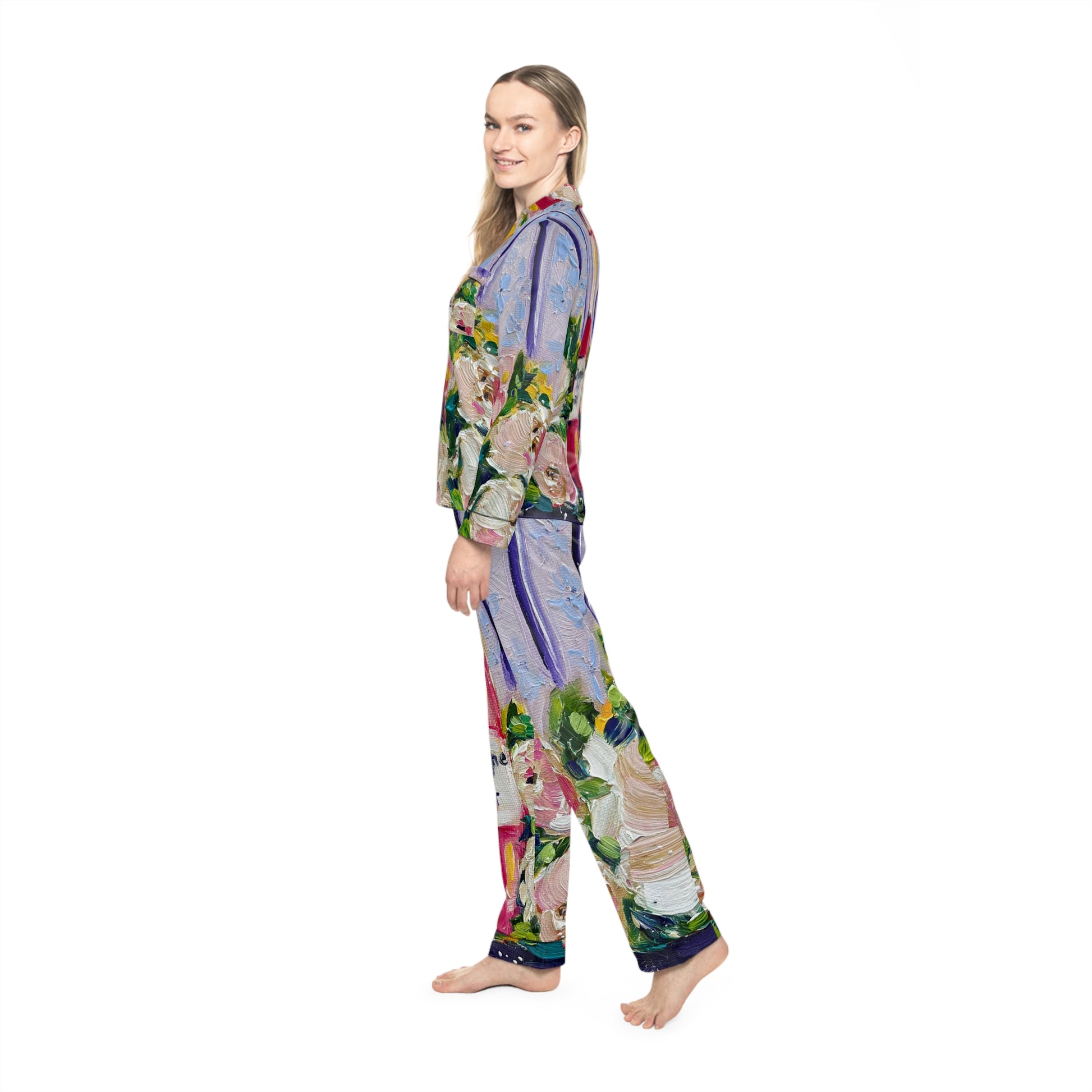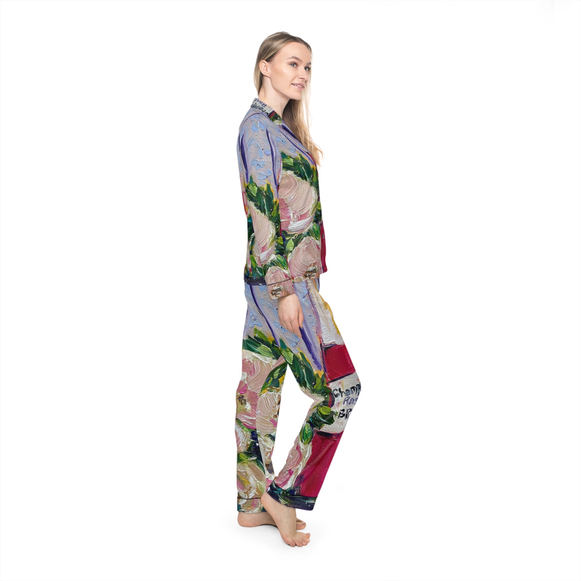 Luxurious satin pajamas with a beautiful painting from Roxy Rich, perfect for a cozy and stylish lounging experience. Ideal for women who love comfort and elegance. Great for relaxing at home, sleepovers, or special occasions like birthdays or bridal showers.