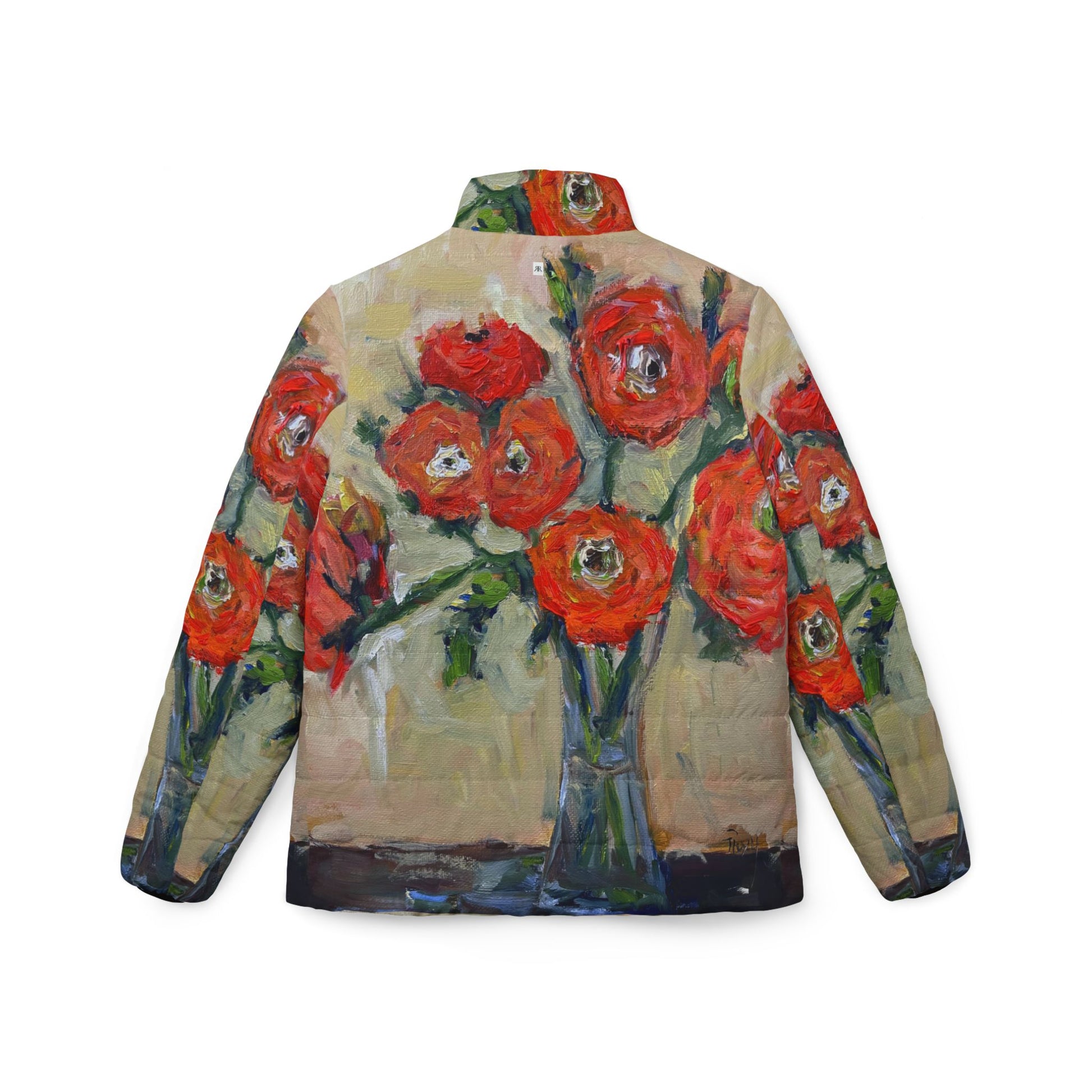 Women's Puffer Jacket - Roxy Rich Fine Art -Orange Ranunculas