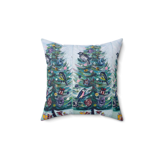 Oreiller carré en polyester filé d’intérieur avec plumes festives et oiseaux dans un arbre de Noël