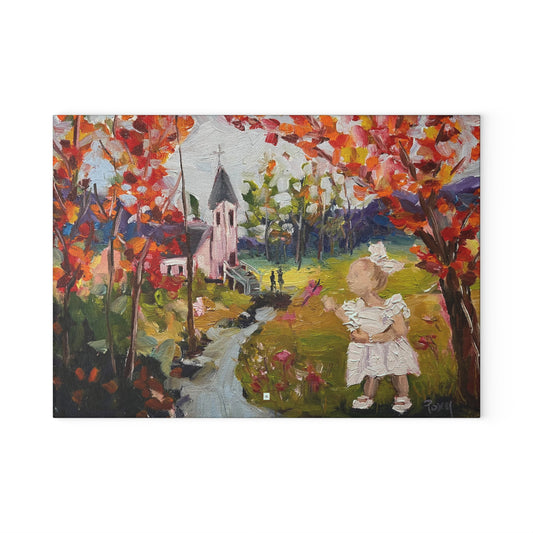 Planche à découper en verre Isla au baptême (paysage d'église rurale avec tout-petit)