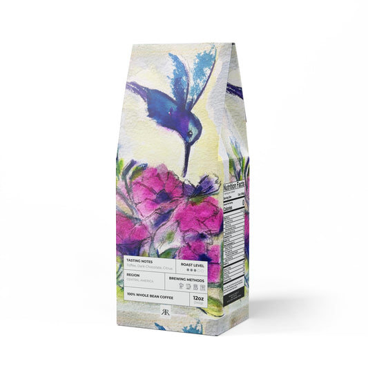 Colibri bleu dans un mélange brillant de fleurs roses jaunes (rôti moyen)