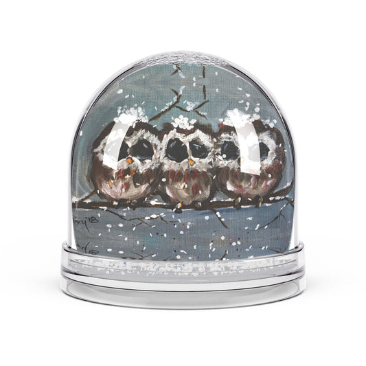 Snow Globe - Three Adorable Owl Chicks perched on a Snowy Branch