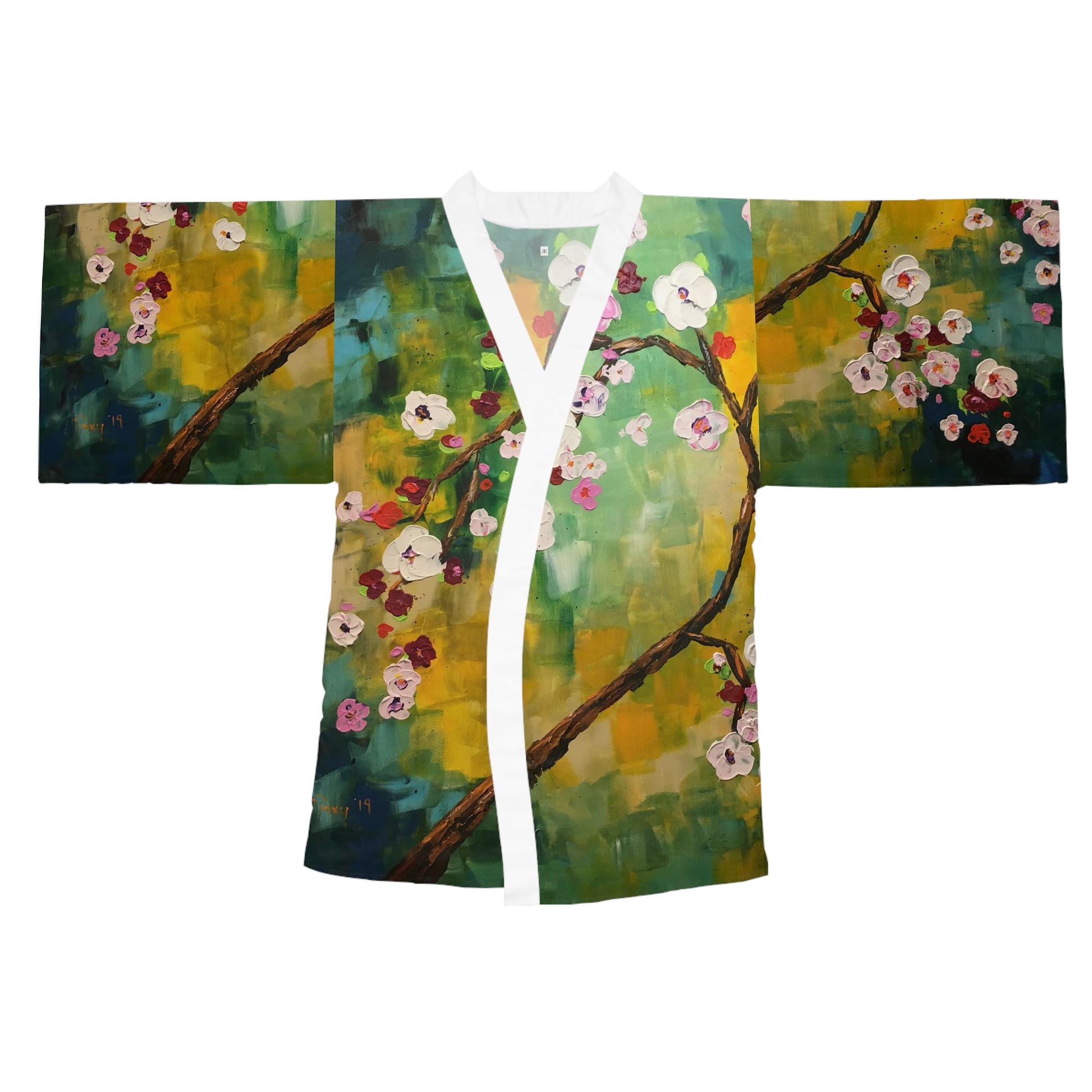 A beautiful kimono robe featuring floral print, giving off a feminine and elegant vibe. Perfect for those who appreciate Japanese aesthetics and want to add a touch of tranquility to their daily routine. Ideal for relaxing at home, getting ready for a special occasion, or as a unique gift for a loved one. Relevant for celebrations like Mother's Day, birthdays, or anniversaries.