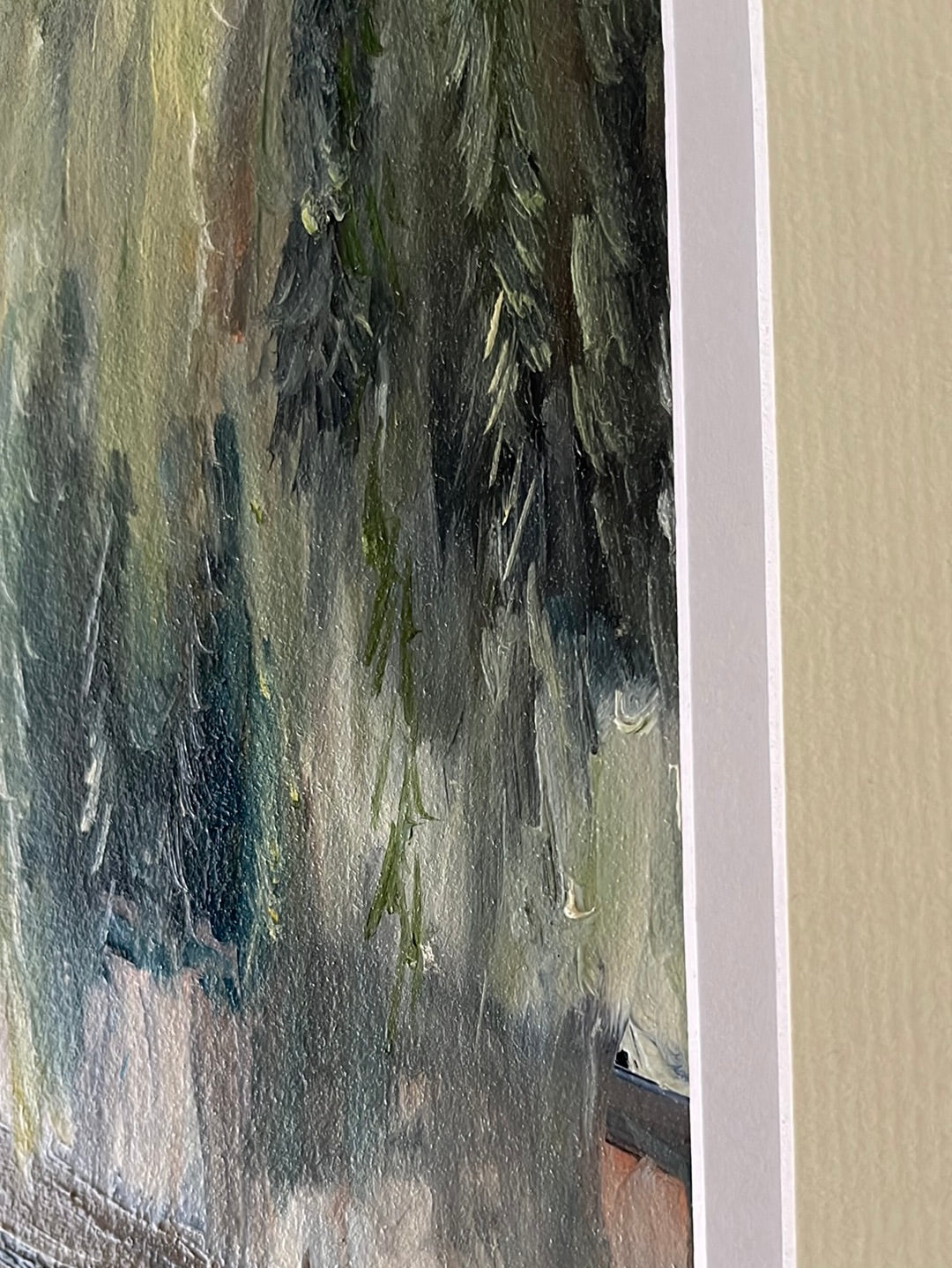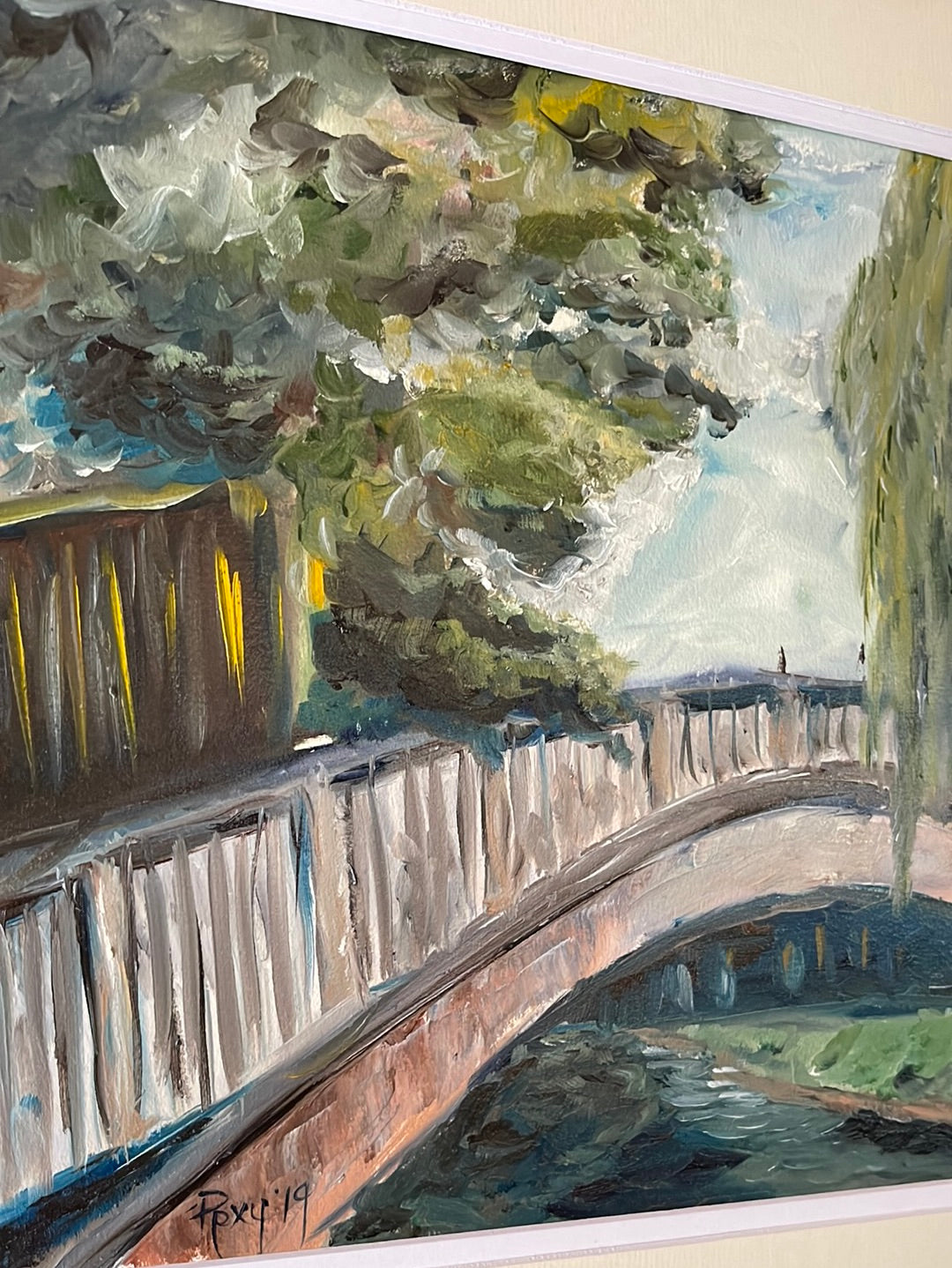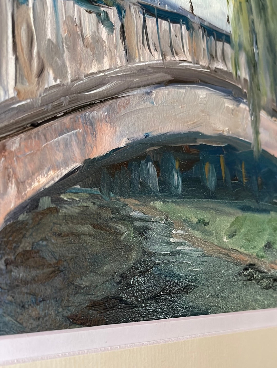 - Lors de ma première visite en Angleterre en 2021, j'ai été enchanté par les routes de campagne et la verdure luxuriante. Un après-midi, nous voyagions de Surrey à Dorking lorsque nous étions sur le point de traverser cette crique. J'ai insisté pour m'arrêter pour photographier cette scène avec le saule pleureur. C'est juste un petit paysage nostalgique. Je ne connais pas le nom de ce pont. Nous nous dirigions vers Dorking depuis Crawley, il s'agit probablement de Shipley Bridge ou de Flanchford Bridge. Même si je peux me tromper. Je l'ai peint à mon retour aux États-Unis. Les tirages sont disponibles via l'onglet "tirages boutique"