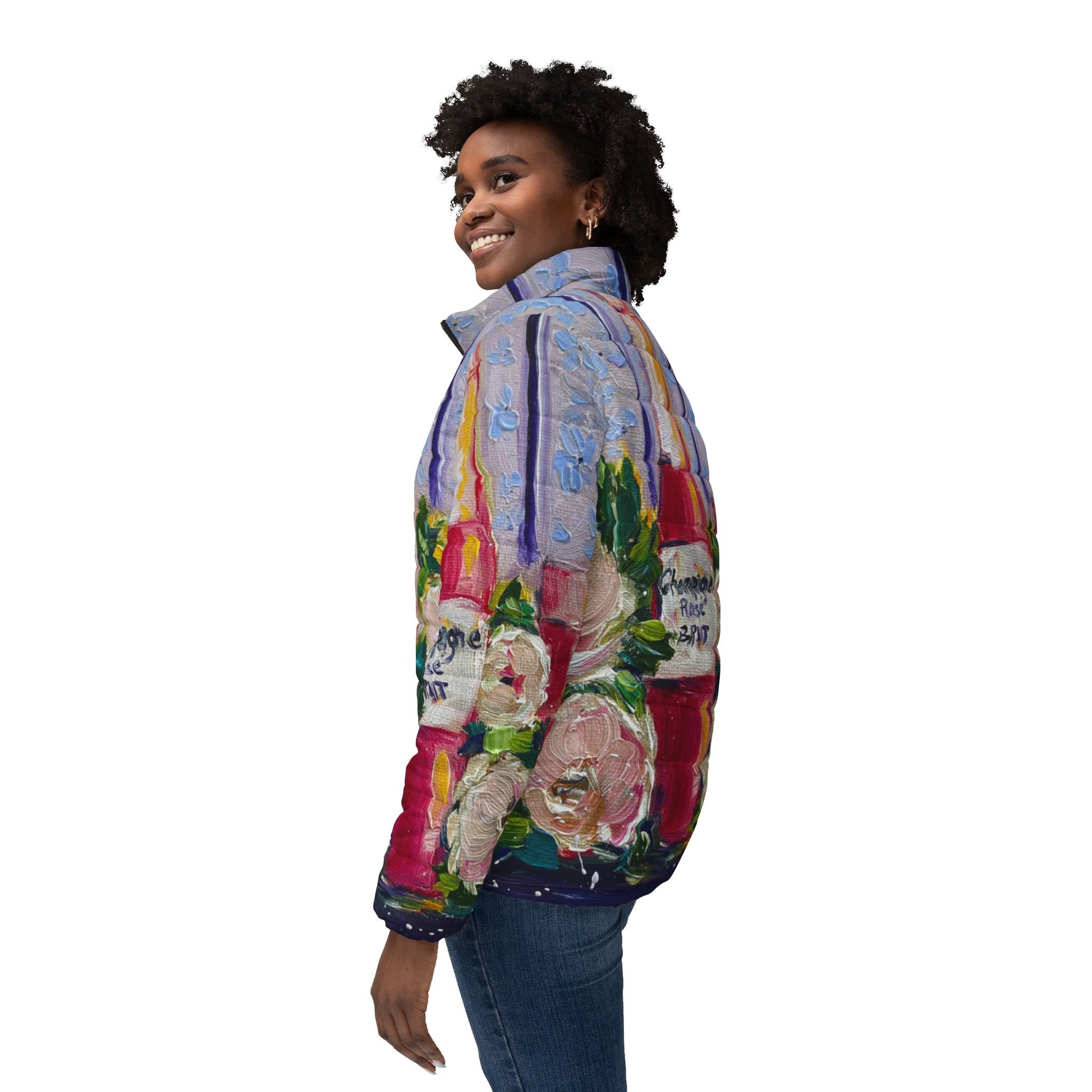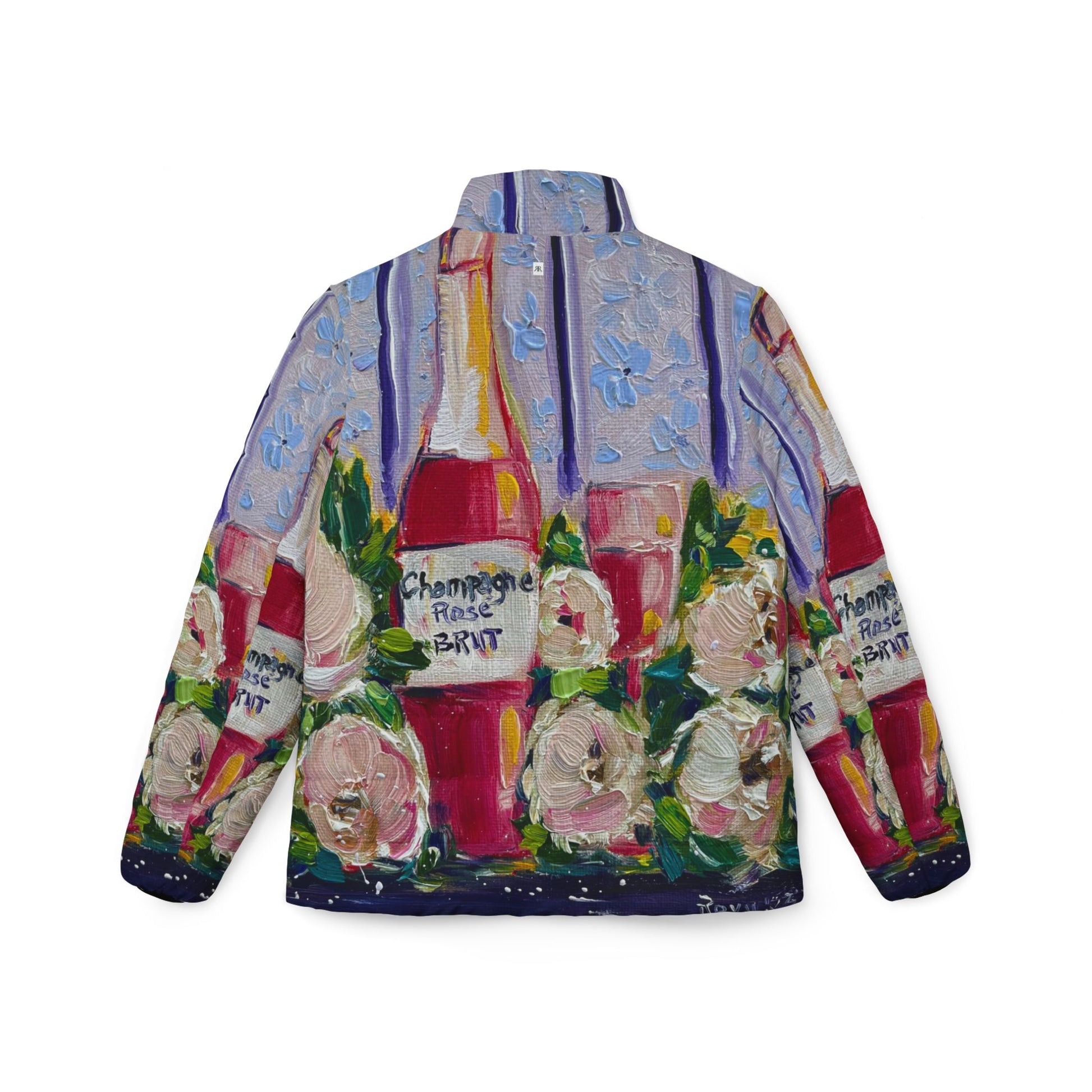 Women's Puffer Jacket - Roxy Rich Fine Art -Pink Champagne and Peonies