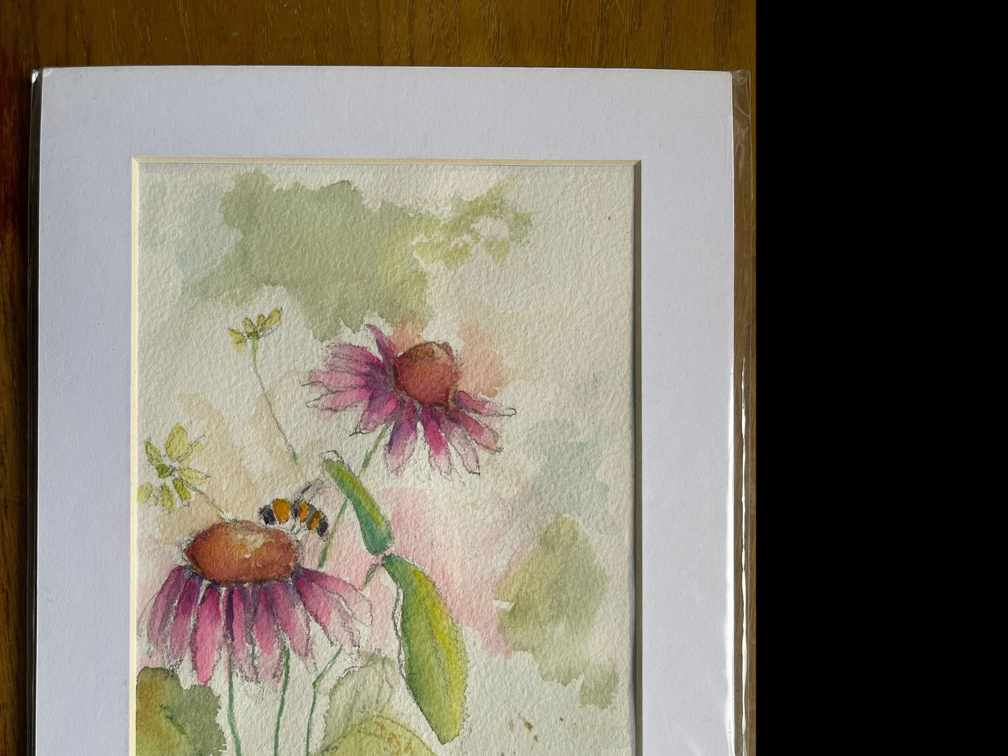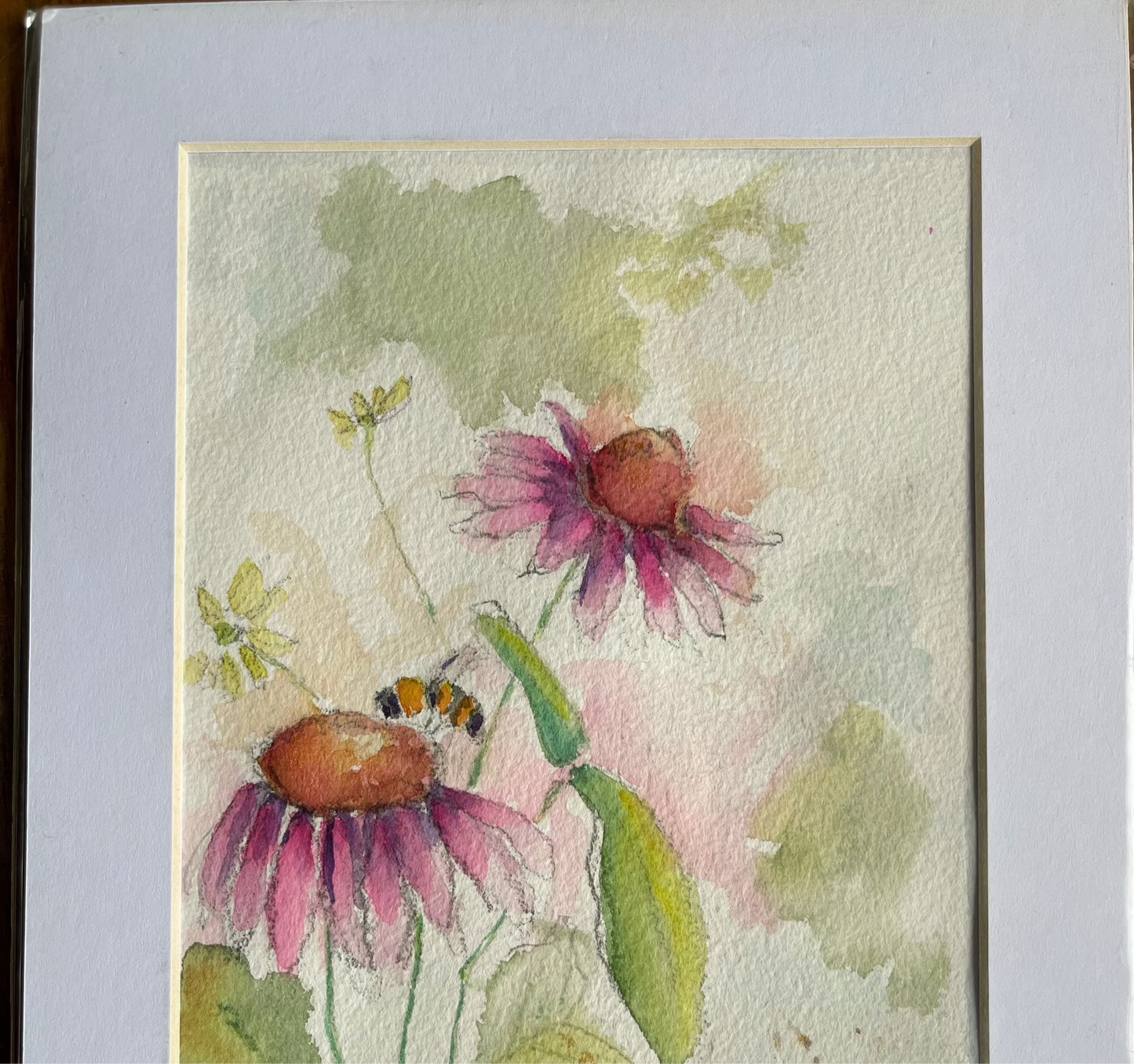 Bumble Bee on a Coneflower Original Watercolor Painting 6x8