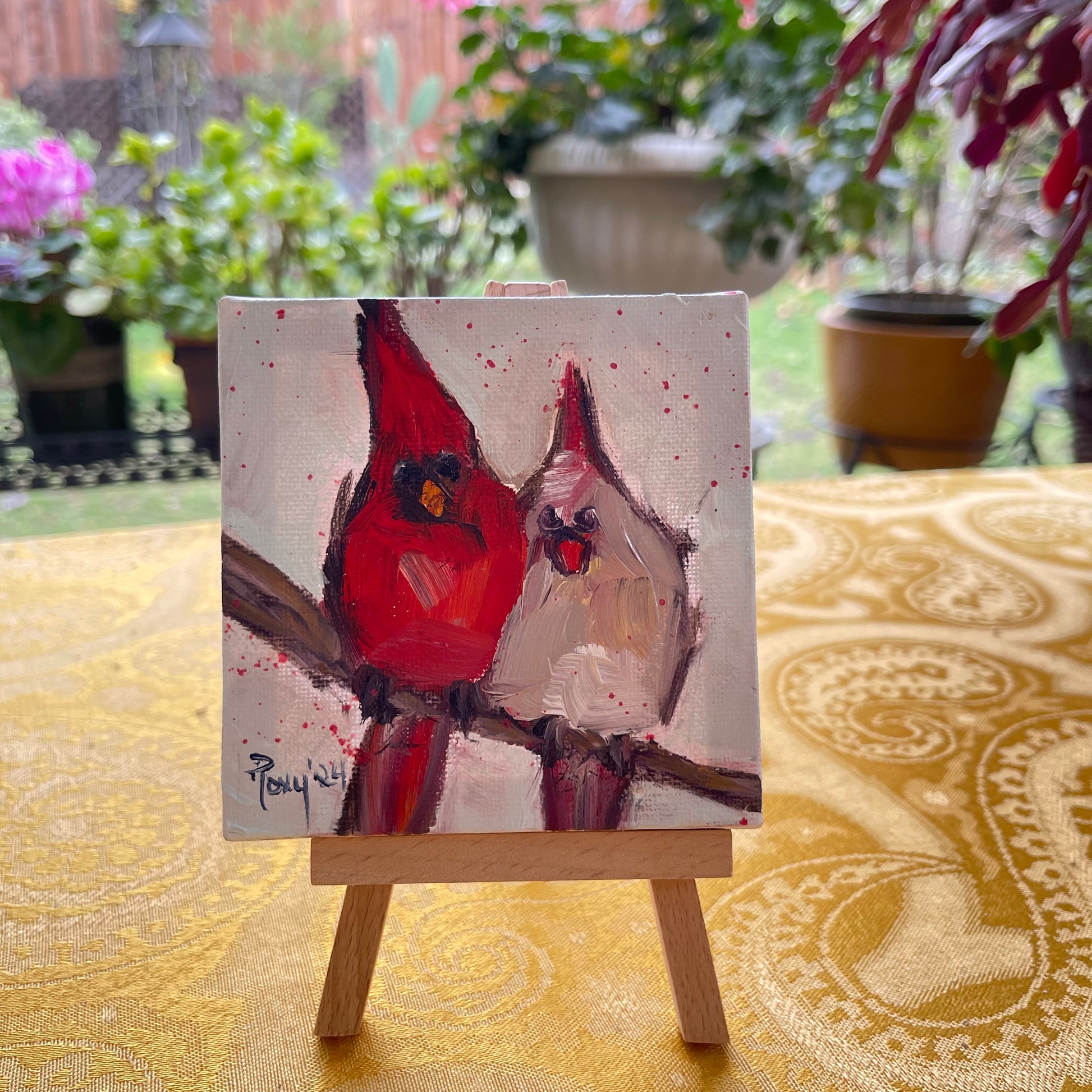 Cute Couple (Cardinals) Original Oil Painting 4x4 Framed