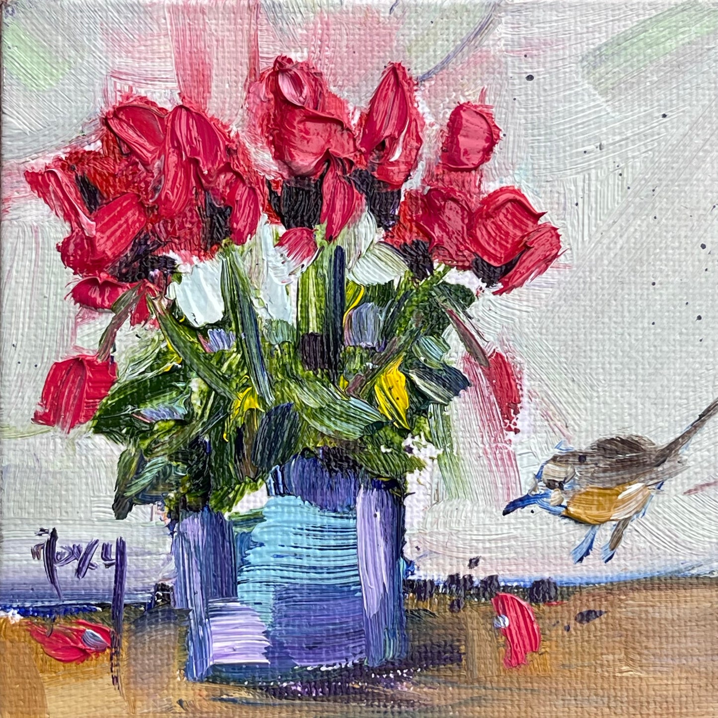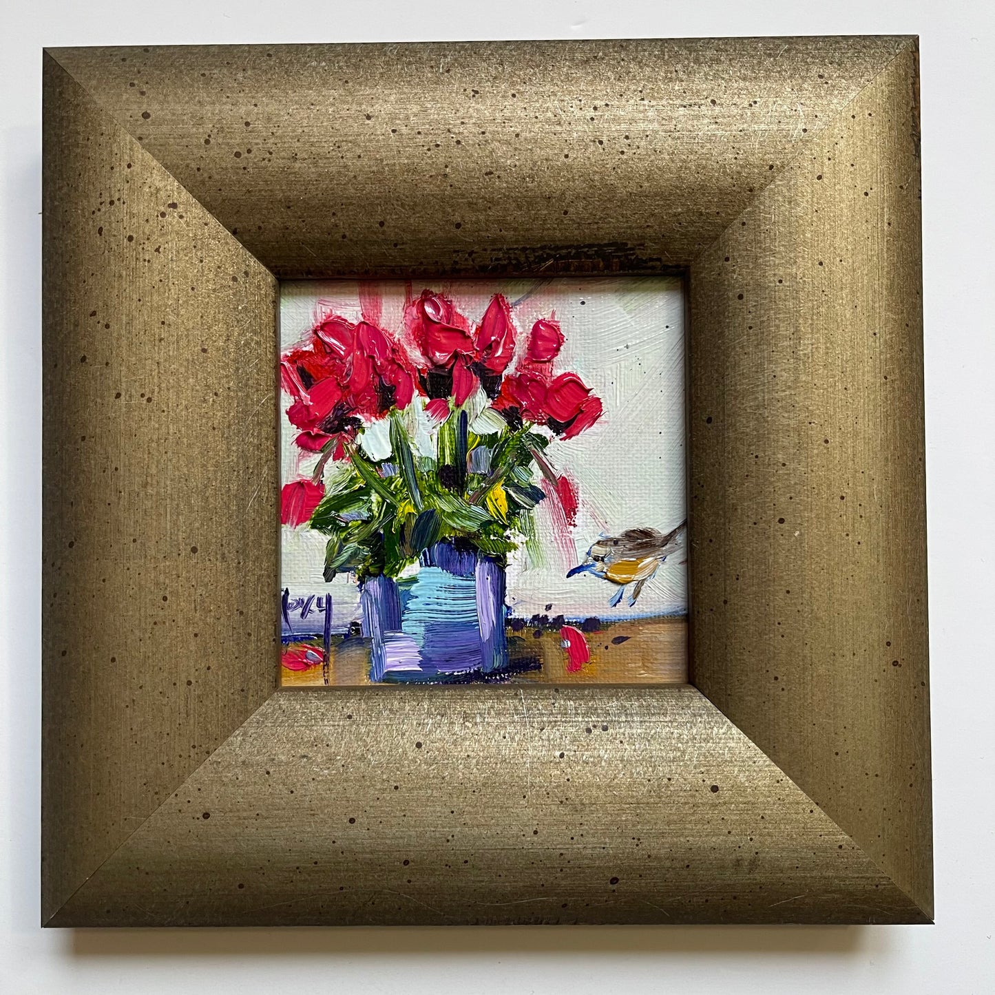 Cyclamen and Wren Original Oil Painting 4x4 Framed