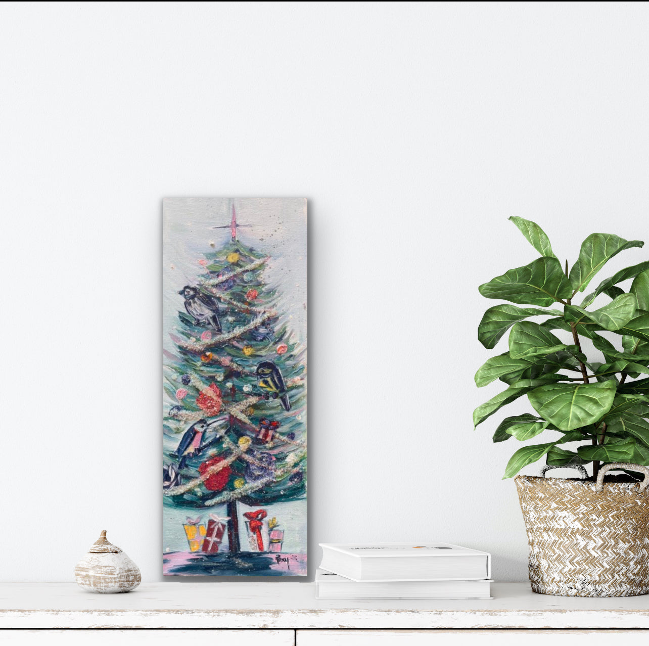 Original Oil Painting; Whimsical Birds in a Christmas Tree