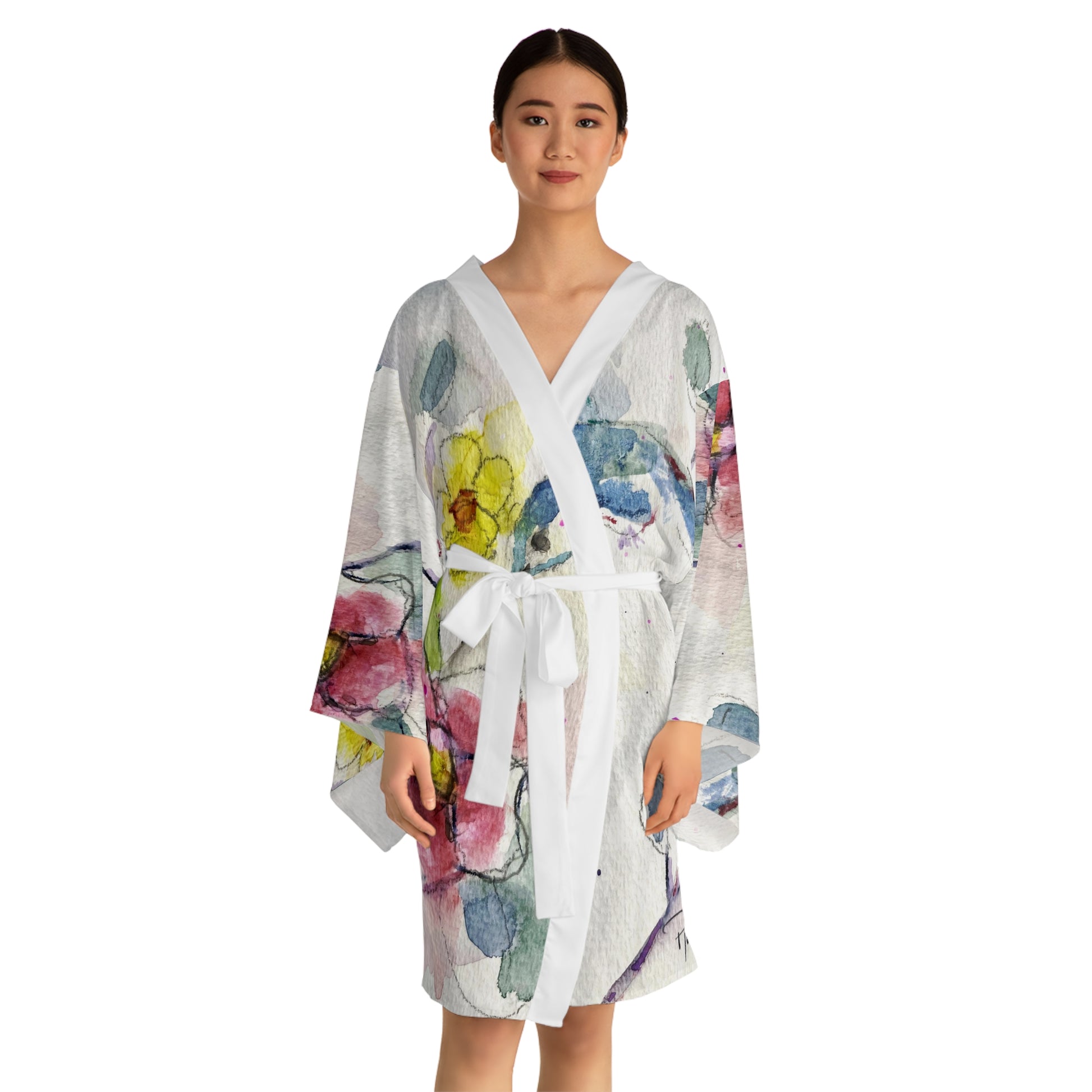 A beautiful kimono robe featuring a cherry blossom print, giving off a feminine and elegant vibe. Perfect for those who appreciate Japanese aesthetics and want to add a touch of tranquility to their daily routine. Ideal for relaxing at home, getting ready for a special occasion, or as a unique gift for a loved one. Relevant for celebrations like Mother's Day, birthdays, or anniversaries.