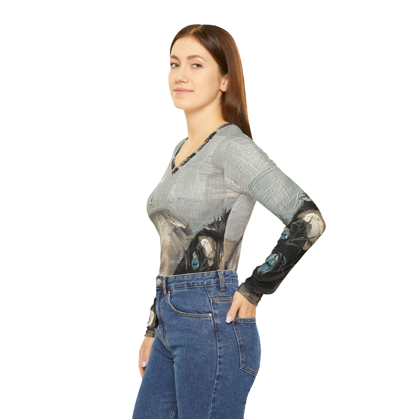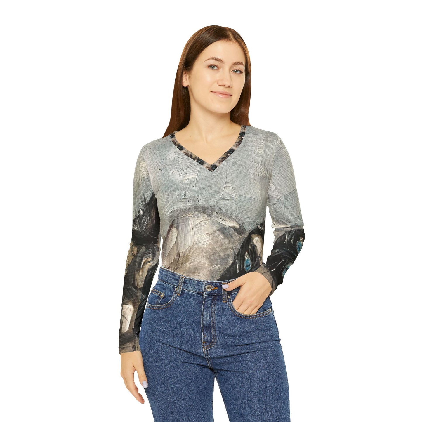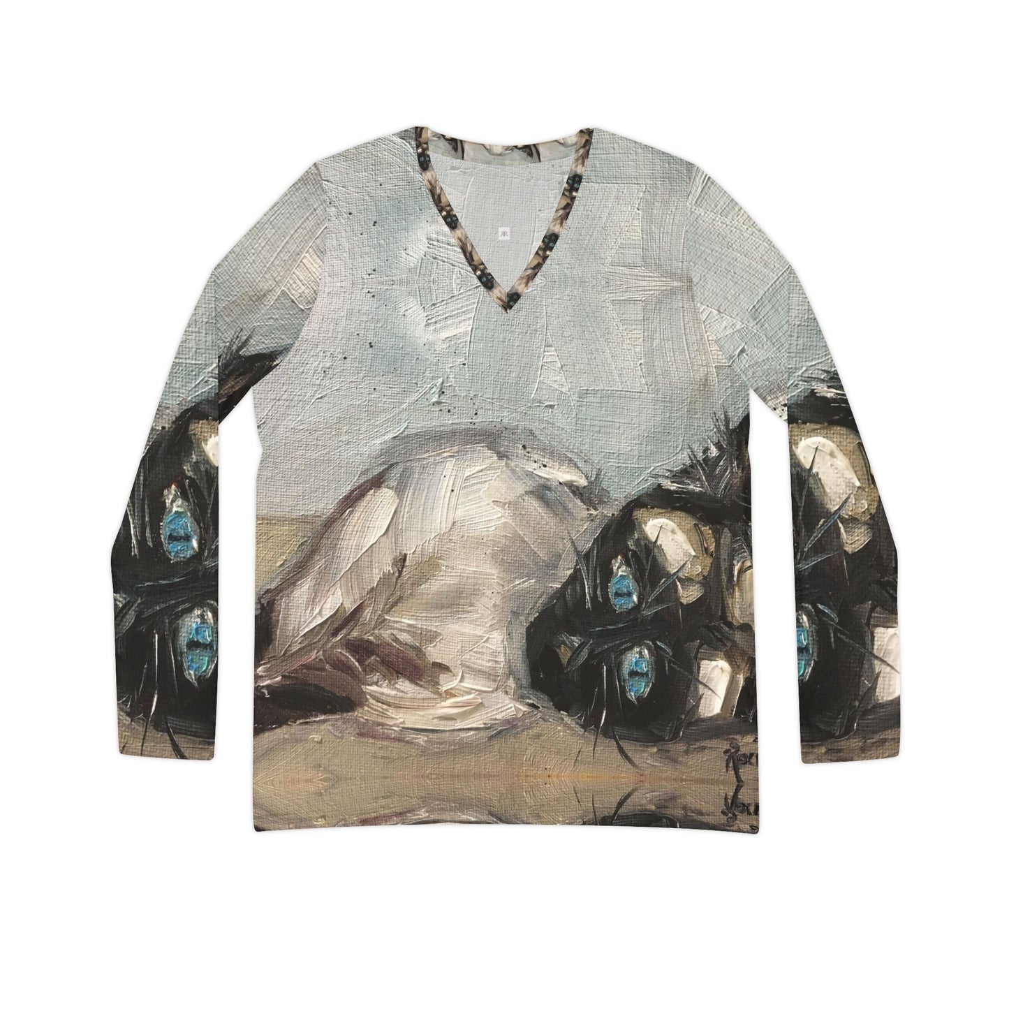Stay comfortable and stylish with this Women's Long Sleeve V-neck Shirt featuring Roxy's painting. Perfect for those dreaming of a tropical getaway, this shirt is ideal for casual wear or lounging. Relevant for beach vacations, summer celebrations, and tropical-themed events.