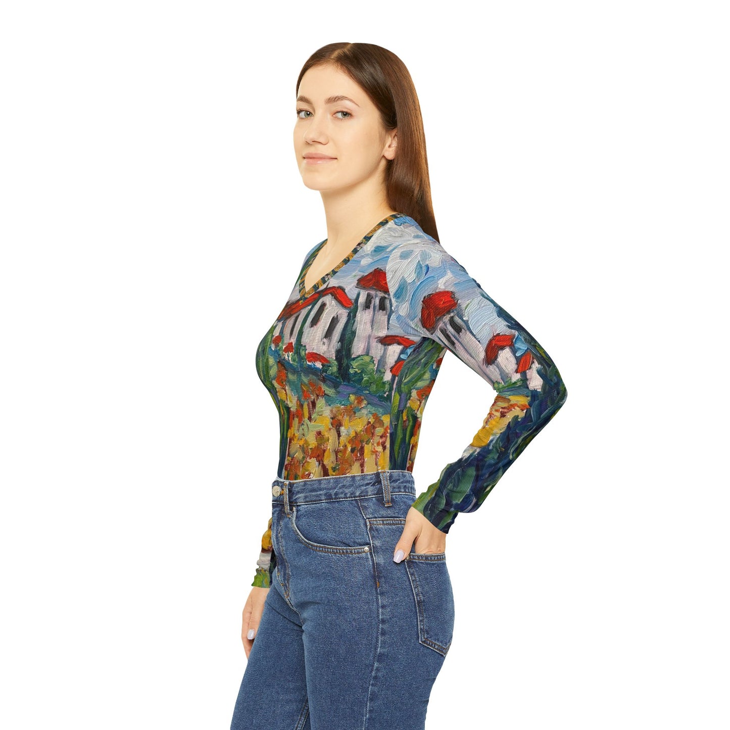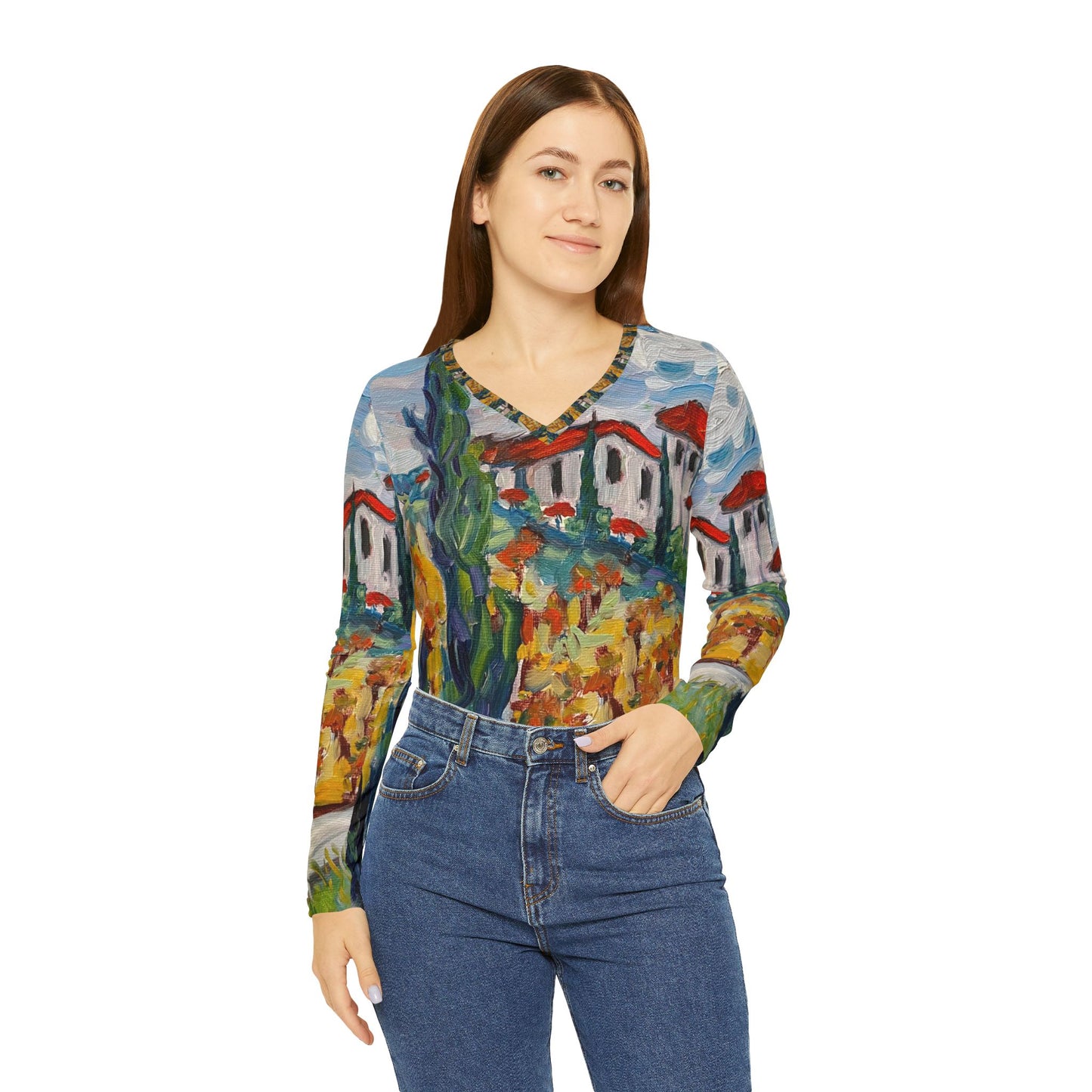 Stay comfortable and stylish with this Women's Long Sleeve V-neck Shirt featuring Roxy's painting. Perfect for those dreaming of a tropical getaway, this shirt is ideal for casual wear or lounging. Relevant for beach vacations, summer celebrations, and tropical-themed events. Pair it with her matching pajama pants for a super cute lounge set!