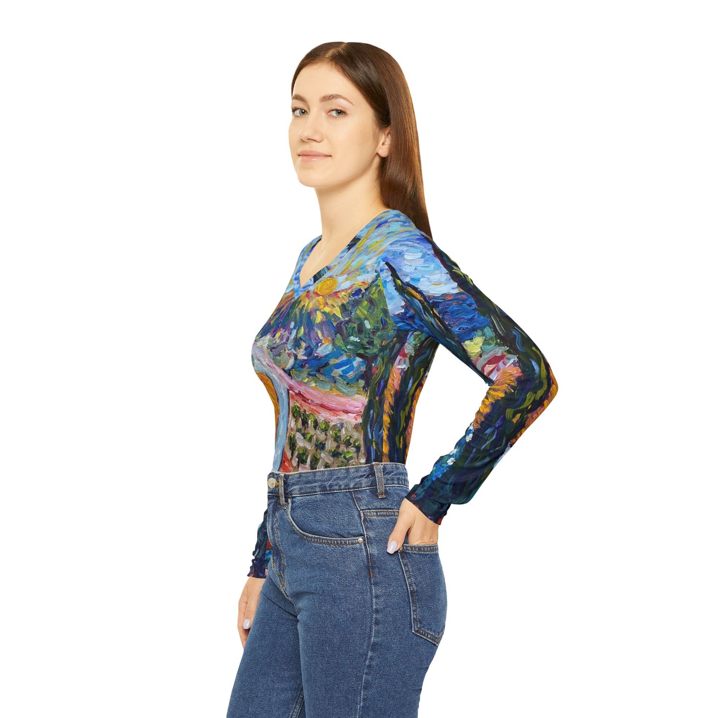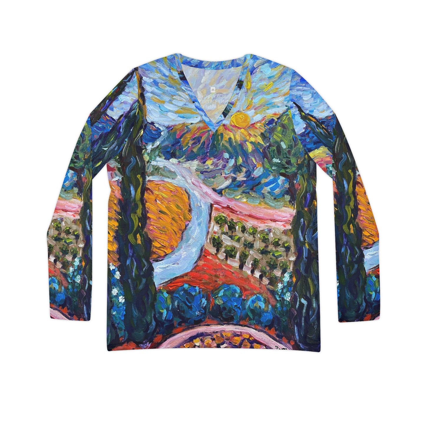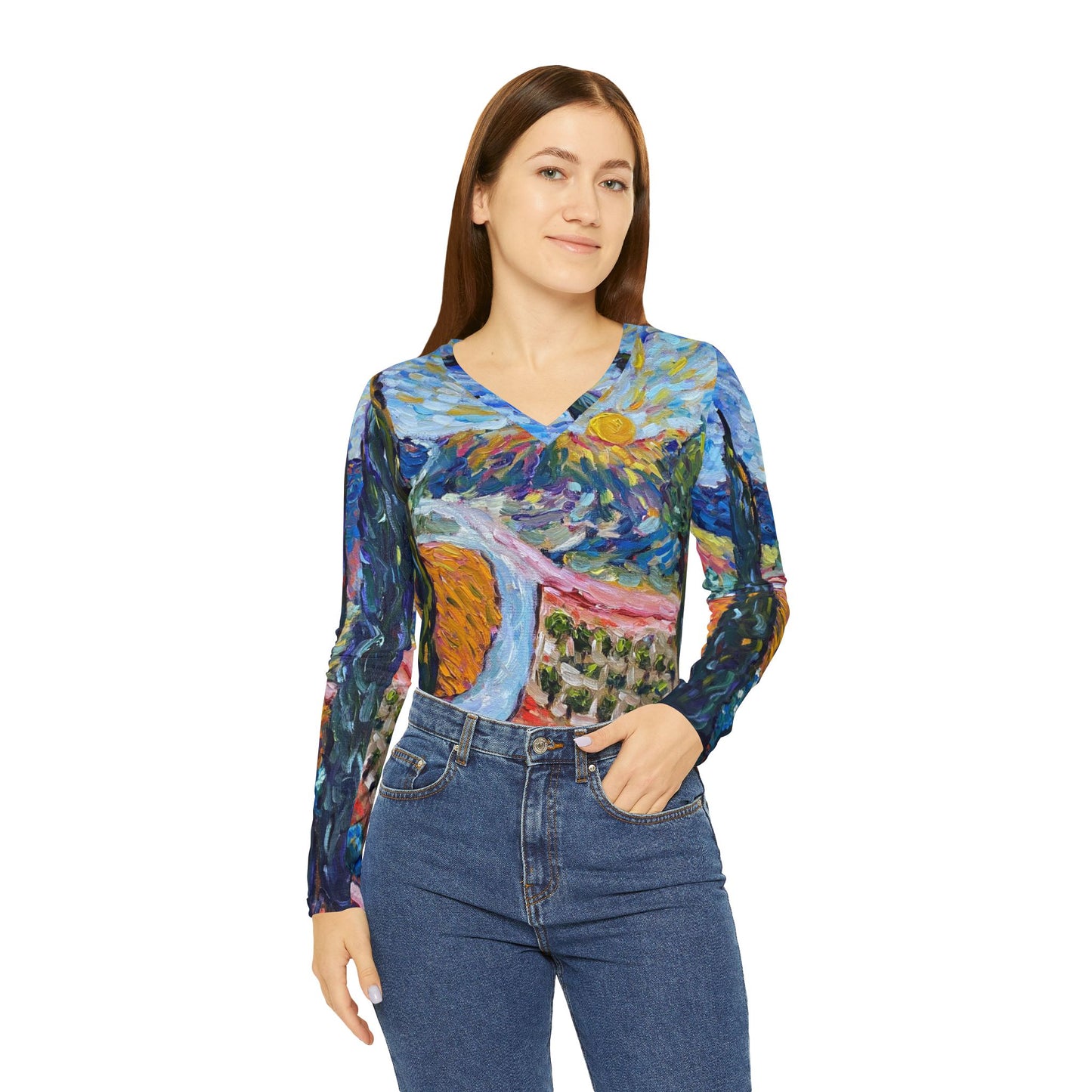 Stay comfortable and stylish with this Women's Long Sleeve V-neck Shirt featuring Roxy's painting. Perfect for those dreaming of a tropical getaway, this shirt is ideal for casual wear or lounging. Relevant for beach vacations, summer celebrations, and tropical-themed events. Pair it with her matching pajama pants for a super cute lounge set!
