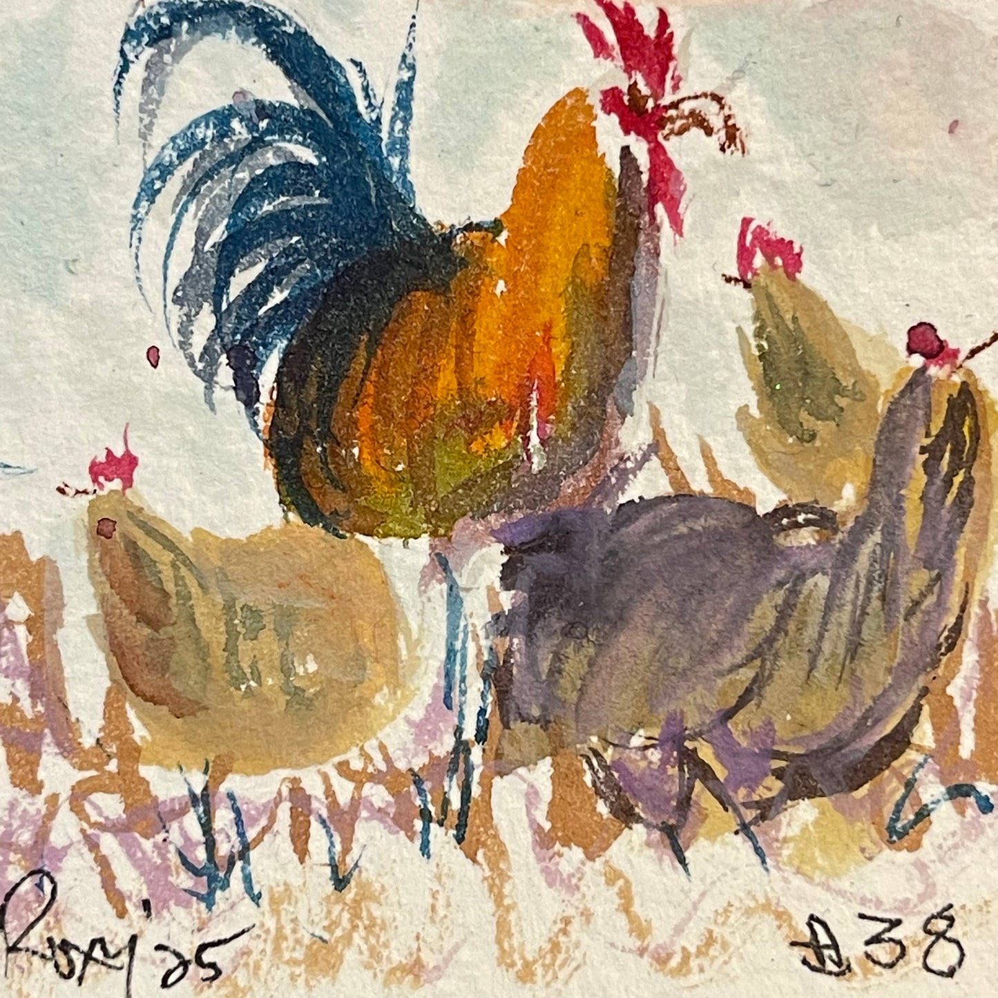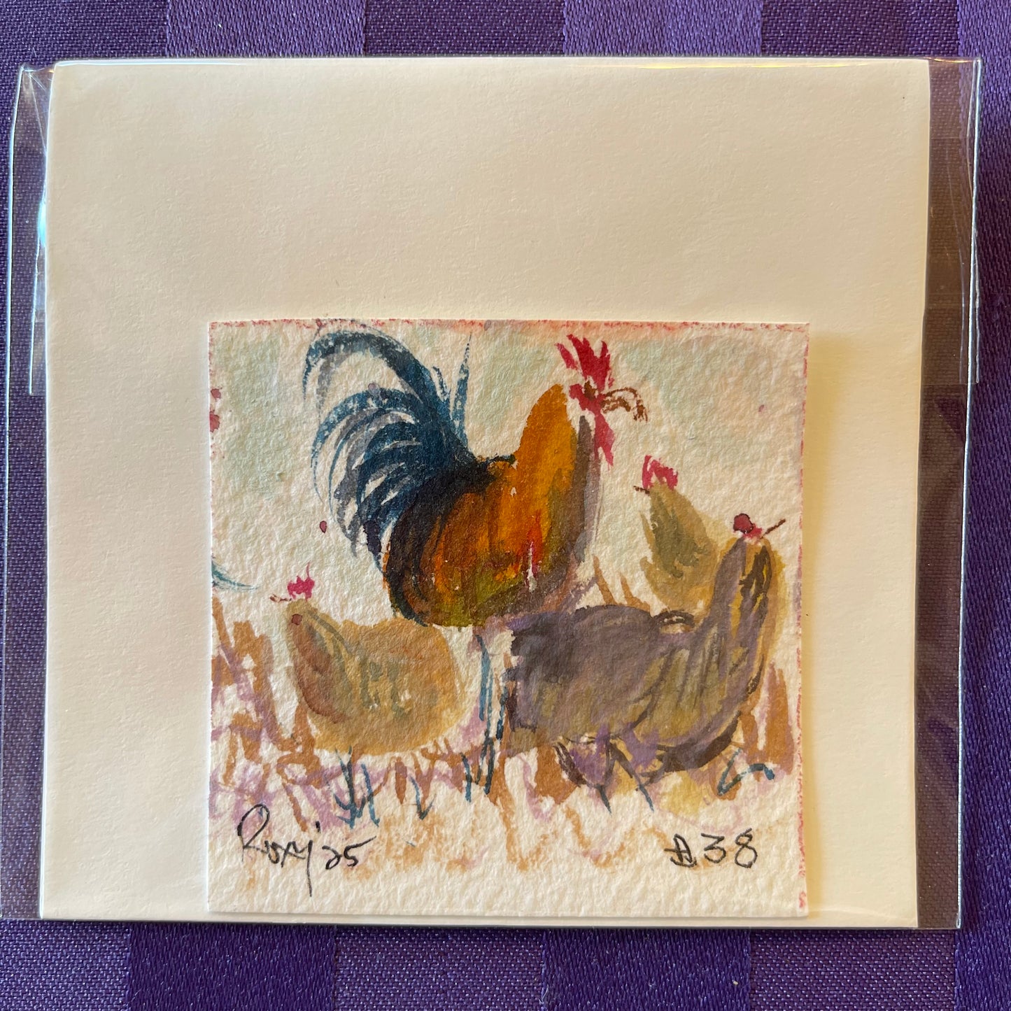 Miniature Rooster #38-with Hens-Original Watercolor Painting