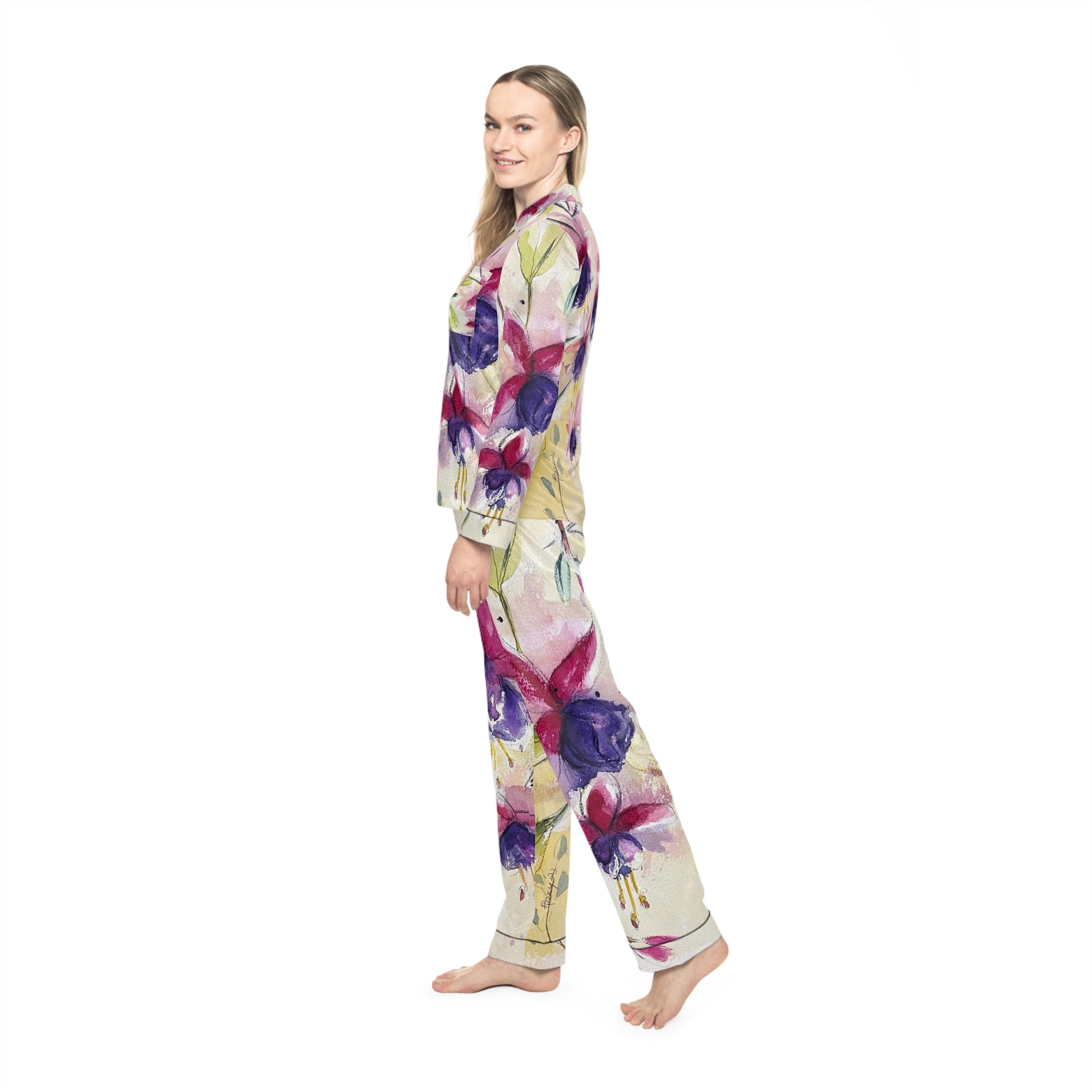 Luxurious satin pajamas with a beautiful painting from Roxy Rich, perfect for a cozy and stylish lounging experience. Ideal for women who love comfort and elegance. Great for relaxing at home, sleepovers, or special occasions like birthdays or bridal showers.