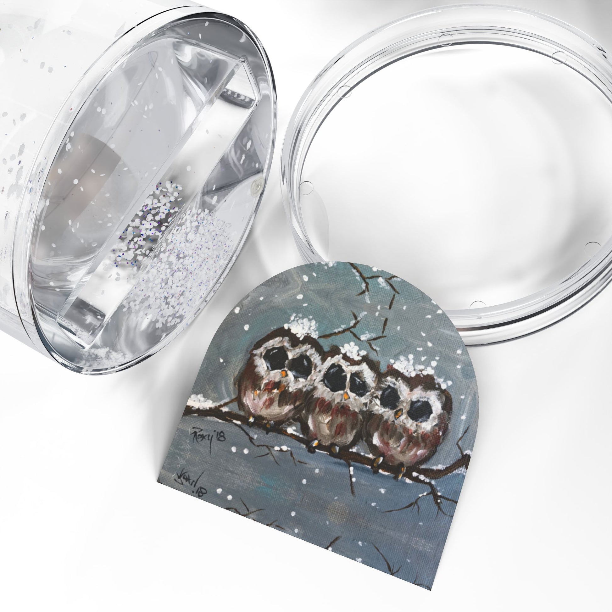 Snow Globe - Three Adorable Owl Chicks perched on a Snowy Branch